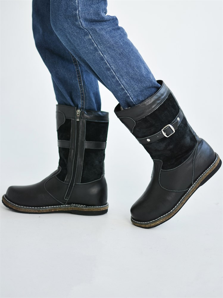 Сапоги подростковые на войлоке черные, кожа, замша, молния(ПВ3-01)